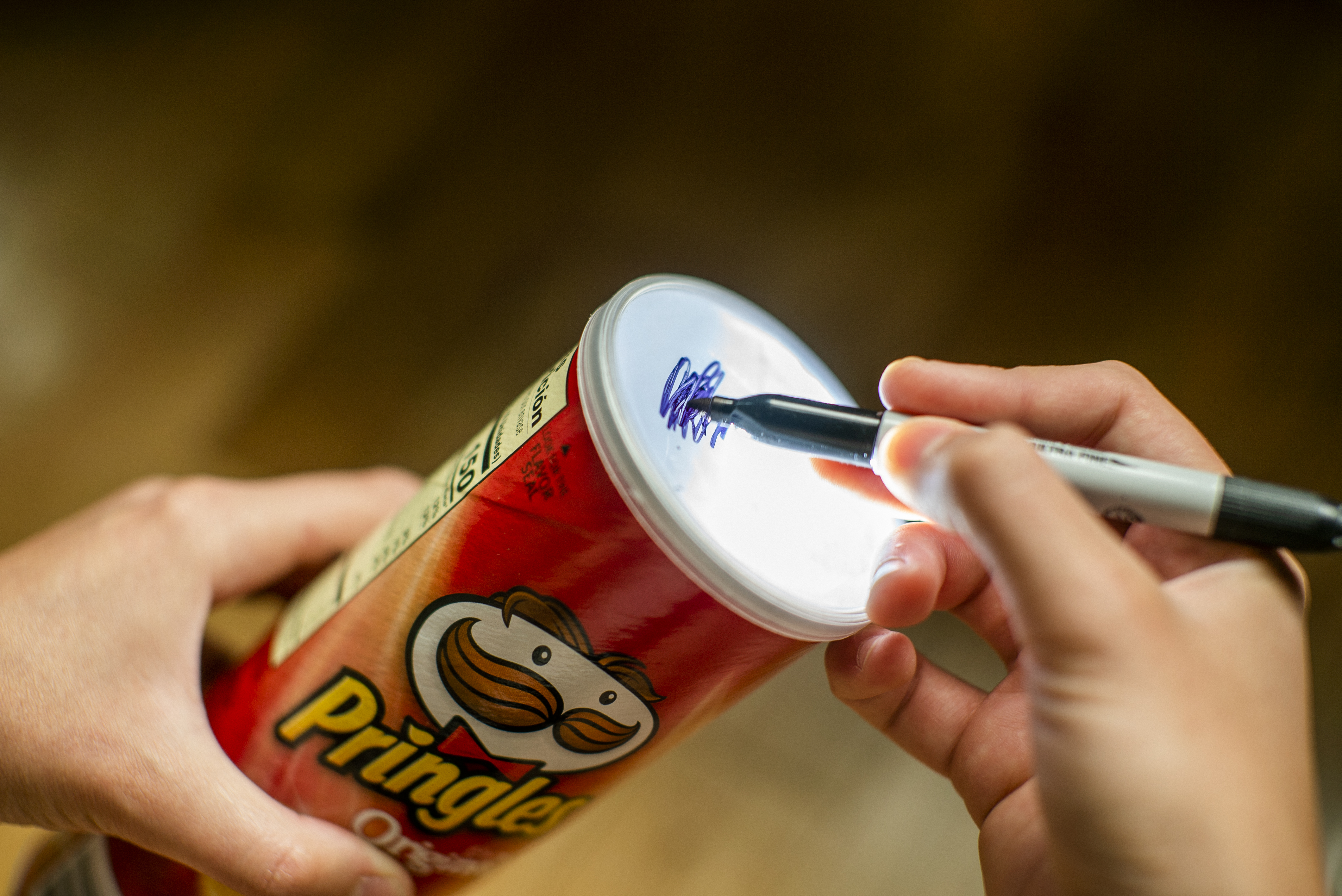 - Limpie su envase de Pringles con una toalla de papel seca, luego usted y su hijo/a tomen la linterna y un marcador permanente.